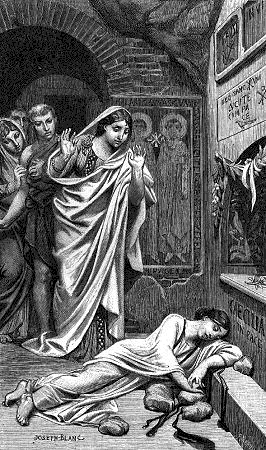 Fabiola et toute sa maison, ayant assisté, en larmes et en prières, à ces rites solennels, descendirent dans la crypte, et, après la célébration de l'office divin, retournèrent auprès de Miriam, revêtue d'habits plus sombres.
