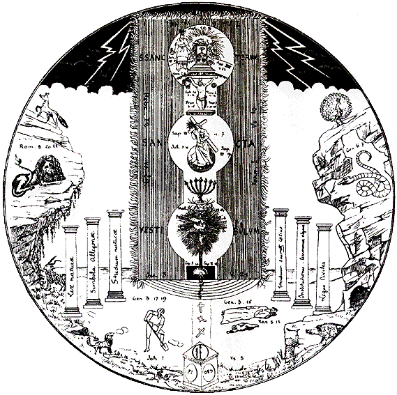 13) La consommation du grand oeuvre philosophique, lequel présente le miroir de la sagesse, où l'on contemple tout ce qui a été, comment il a été, tout ce qui est et sera, la consommation de cet oeuvre, dis-le, jointe à la consommation de la vie de la croix, par une mort intérieure avec le Sauveur, ouvre l'entrée du sanctuaire du temple, de la région paradisiaque de la lumière (Genèse Il - 8), de l'habitation de l'Eden renouvelé (Apocalypse XXI. 1 . 23), de la demeure des plus grands sages, qui ont tous les dons de l'apostolat (Matthieu X. 8), des vrais pasteurs (St Jean X. 2), des prêtres, qui offrent toujours à Dieu un sacrifice pur; des rois, qui sont maîtres d'eux-mémés et de la nature (2 Timothée Il. 11. 12).